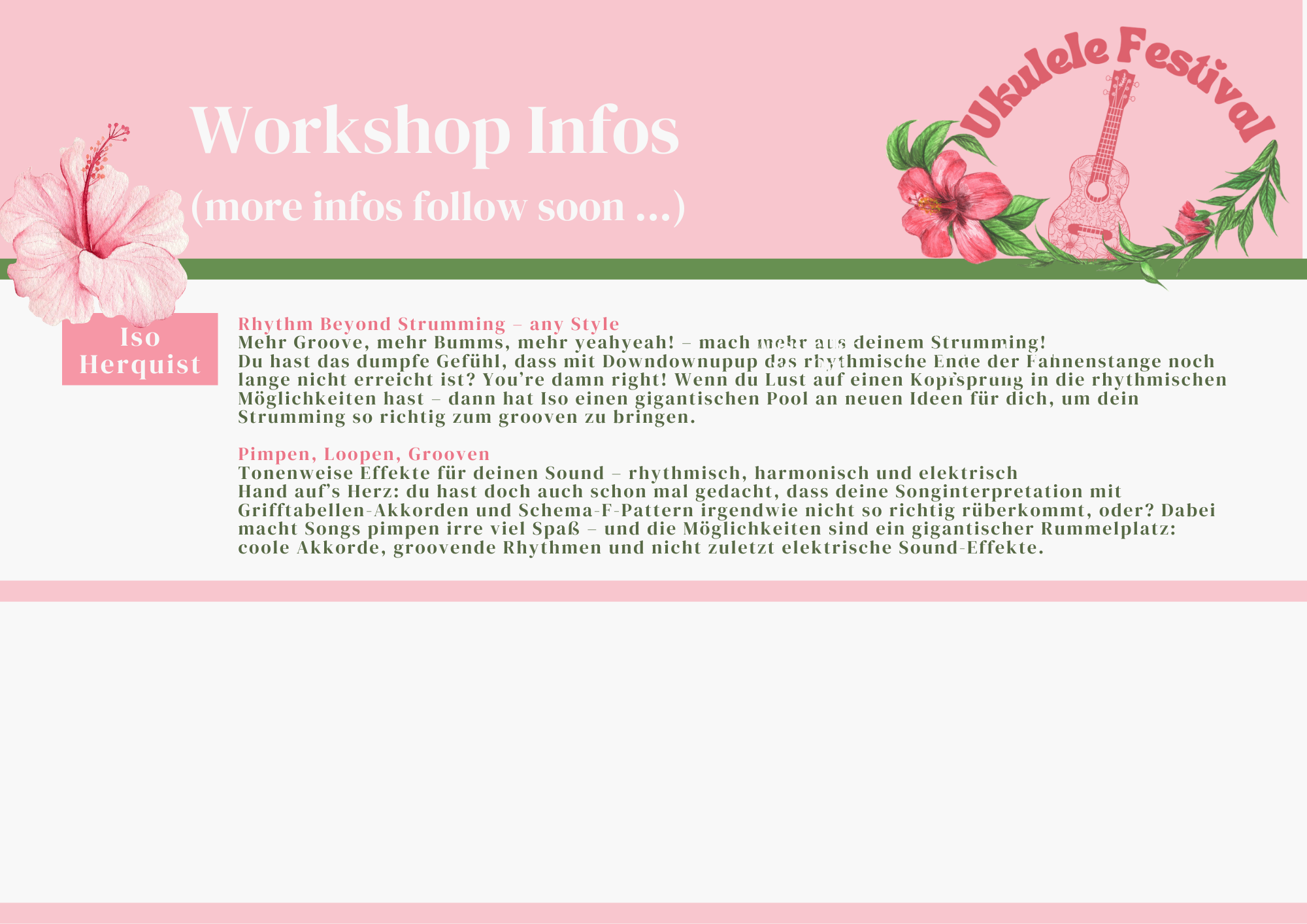 Verbessere deine Fähigkeiten und lerne neue Techniken von unseren professionellen Musikern in unseren Workshops. Alle Besucher, die keinen Workshop besuchen können am Ukulele Flashmob teilnehmen – bitte dazu eigene Ukulele mitbringen!